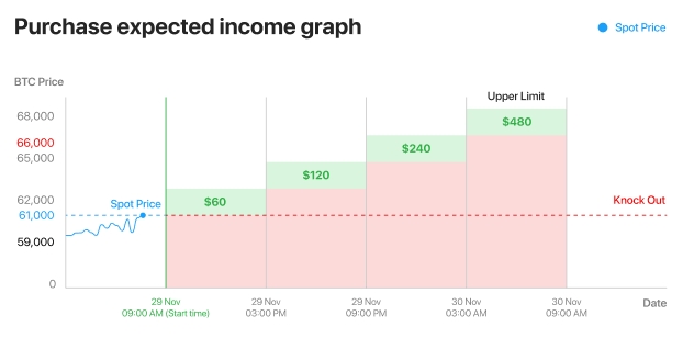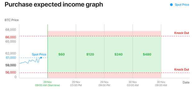 Saddle Option: This product will let you bet on the volatility of an asset. The goal is to stay within a given price interval for a given amount of time. The longer you stay on the “Saddle” the more rewards you accumulate.